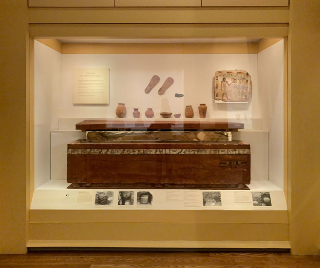 The coffin set of the General’s Charioteer, Iotefamun (this outer coffin, with an inner coffin (26.3.2a, b), and a mummy board (26.3.3) was found in a reused tomb, where earlier burials had been robbed and pushed aside. Iotefamun’s coffins were set against one wall, with his canopic box resting on the lid of the outer coffin. The lid of this coffin was not completely closed, as the inner coffin, made originally for a priest and copper engraver of the temple named Nesiamun, was slightly too large. Inside the coffin set was the mummy, which had been wrapped in linen and then covered from waist to feet with a soft hide, perhaps from a gazelle, and a whip (26.3.2a, b)