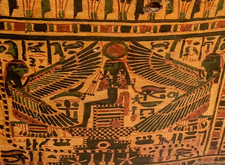 The layout and decoration of the lid is similar to that of the outer coffin, with the deceased in a tripartite wig with floral fillet, elegant features and large ears, and hands fisted over the chest. A winged figure of Nut again divides the upper and lower parts of the lid. In this case, the space above contains a djed pillar flanked by deities in human form; the lower part is divided by bands of inscription into 10 symmetrical sections containing illustrations from Egyptian mythology. Additional illustrations adorn the sides of the box. In contrast to the outer container, this coffin has been varnished.